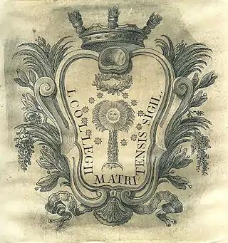 El primer escudo y sello del Colegio aparece en el siglo XVIII, sin quedar constancia de la fecha exacta de su diseño, si bien se señala un fecha aproximada entre 1732 y 1772, cuando ya aparece oficialmente reflejado en los estatutos.[35][36] El escudo aparece en la base con una luneta, una media luna con rostro mirando hacia abajo. Sobre esta luneta nace un tronco sin ramas ni raíces sosteniendo un sol con rostro humano rodeado por dos círculos concéntricos. El escudo está timbrado con una corona de nobleza.[35]