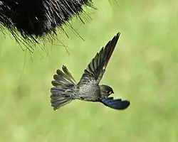 Mide entre 9-11,5 cm de largo.[3] El plumaje de sus partes superiores es negro azulado brillante, incluido el obispillo. Su pecho es negro, y su vientre y costados son blancos, con montitas negras en los bordes. Sus alas son largas con las puntas redondeadas y su parte inferior negra. Su cola es ligeramente ahorquillada pero con extremos redondeados, y alguna manchita blanca.