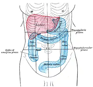 ![]() Parte delantera del abdomen, el intestino grueso en azul. | ||