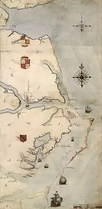 ![]() Mapa de Virginea Pars, que incluye la isla de Roanoke, dibujado por John White durante su primera visita en 1585. | ||
