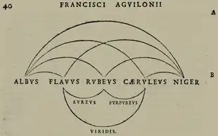 - MacEvoy, Bruce. «handprint : atributos de coloración». www.handprint com. Consultado el 1 de diciembre de 2020. «Desde una perspectiva moderna, la característica más peculiar de la teoría de d'Aguilon es que estos tres tonos "nobles" se crearon a partir de la misteriosa mezcla de blanco y negro, o claro y oscuro (líneas curvas superiores de la figura), de modo que claro y oscuro eran los dos colores "simples" o primarios. Los tonos "compuestos" verde, naranja (dorado) y púrpura (líneas curvas. Los tonos "compuestos" verde, naranja (dorado) y púrpura (líneas curvas inferiores) se mezclaron a partir de los colores de la tríada "noble". El diagrama de D'Aguilon fue reproducido por el erudito jesuita Athanasius Kircher en su tratado de óptica Ars magna lucis et umbrae (El gran arte de la luz y la sombra, 1646). Ambas fuentes fueron muy leídas en el siglo XVII y dieron forma a la explicación de la mezcla de colores dominante durante el Barroco.»