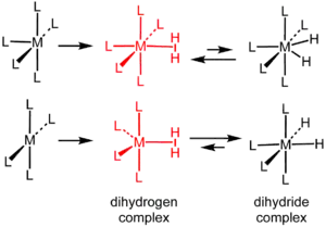 Dos métodos de preparación involucran la reacción directa con gas H2. El primero implica la adición de H2 a un centro metálico insaturado, como se reportó originalmente para W(CO)3(P-i-Pr3)2(H2). En algunos casos, el H2 desplazará ligantes débilmente unidos, incluso halogenuros en casos favorables: