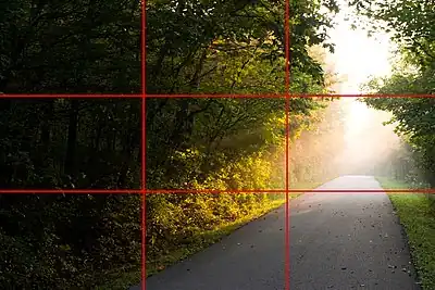 La regla de los tercios es una pauta seguida comúnmente por los artistas visuales. El objetivo es evitar que el centro de interés y los objetos (tales como el horizonte) corten la imagen por la mitad, poniéndolos cerca de una de las líneas que dividirían la imagen en tres columnas y filas iguales, idealmente cerca de la intersección de esas líneas.