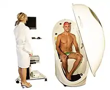 Otra técnica para medir la composición corporal se ha desarrollado para medir el volumen corporal utilizando un método diferente al pesaje bajo el agua. La técnica utiliza aire en lugar de agua y se conoce como pletismografía de desplazamiento de aire (ADP). Los sujetos entran en una cámara sellada que mide el volumen de su cuerpo a través del desplazamiento del aire en la cámara. El volumen corporal se combina con el peso corporal (masa) para determinar la densidad corporal. Luego, la técnica calcula el porcentaje de grasa corporal y masa corporal magra (LBM) a través de ecuaciones empíricamente similares a las utilizadas con pesaje bajo el agua (para la densidad de grasa y masa libre de grasa).