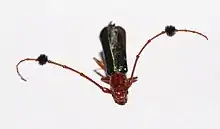 Compsocerus violaceus[5] es reconocido por sus tonalidades verdes tornasoladas, cuerpo rojo y antenas muy desarrolladas comunes en los cerambícidos. Es una especie xilófaga y puede perforar la madera de árboles vivos o madera sin tratamiento, como así también se alimenta del polen de algunas especies. Compsocerus violaceus se considera una plaga agrícola, que ataca a varias especies de árboles cultivados, como acacias, eucaliptos, sauces, higueras, árboles de cítricos y melocotoneros.[6]