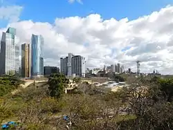 ![]() Vista de las torres de Catalinas, la Torre Monumental, el Sheraton Buenos Aires Hotel y las estaciones de ferrocarril de las líneas Mitre y Belgrano desde el Hotel de Inmigrantes, en el barrio de Retiro.