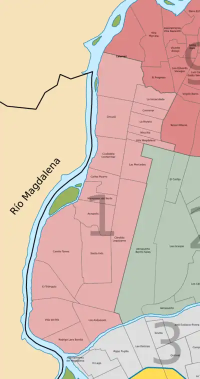 Partiendo del puente Misael Pastrana Borrero de la Carrera 2 con el Río Las Ceibas se sigue aguas abajo hasta su desembocadura, se continúa por el Río Magdalena margen derecha aguas abajo hasta la proyección del eje de la calle 74 y de ahí se sigue en sentido oriental hasta encontrar la calle 75, continuando por ésta hasta la intersección con la línea férrea, se sigue por esta vía en sentido sur hasta la intersección de la carrera 5 con calle 61, de ahí se sigue en sentido este hasta la carrera 2 con calle 58 y de ahí s
