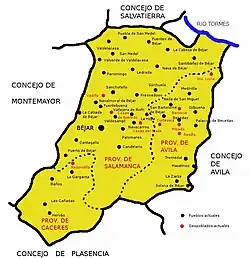 El alfoz o comunidad permaneció inalterable hasta la creación de las provincias actuales, cuya delimitación es totalmente convencional, y este hecho administrativo "descabaló la cohesión de las viejas comunidades".El alfoz de Béjar se le puede considerar entre los medianos, 48 núcleos de población, pues los había muy extensos como Soria, que contaba con 238 pueblos o Ávila , que disponía de 305. Béjar, una vez conquistada, nació sólo como concejo de frontera; le faltaba su tierra y esta no es otorgada fundamentalmente hasta el reinado de Sancho IV.[8]