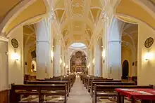 De tres naves, separadas por fuertes pilastras y arcos de medio punto, con acentuado crucero cubierto de cúpula con linterna, y presbiterio elevado. La techumbre de la nave es de escayola, y sobre ella se conserva, invisible, un artesonado primitivo mudéjar. A los pies del templo, coro alto.