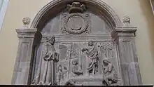 En la nave central, al pie del presbiterio, se ven varias lápidas o fragmentos recogidos de los muchos que ocuparon antiguamente el templo.