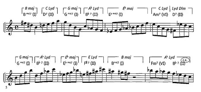 - A través de la interválica de quintas, surge naturalmente el tritono sin necesidad de justificación melódica o armónica, tal como aparece en el sistema tonal. Russell además, justifica la inclusión de esta cuarta aumentada por su aparición (aunque lejana e imperfecta) en la serie armónica (11º).