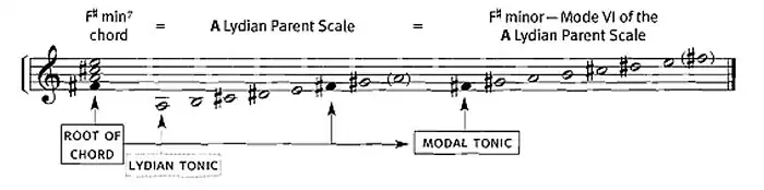 La fundamental de un acorde es su tónica modal dentro de la escala matriz. El sonido del acorde en ese momento, es ese modo de la escala matriz que comienza en la tónica modal del acorde. El acorde de F#m7 en el ejemplo, surge del VI modo de la A Lidio como su escala matriz. Así, el modo correspondiente a dicho acorde es la escala que se produce sobre ese grado (VI) de A Lidio.