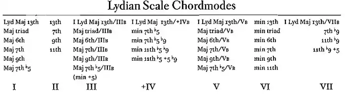 Por ejemplo, esta es la carta o listado de los tipos de acordes que se generan sobre cada modo de la Escala Lidia: