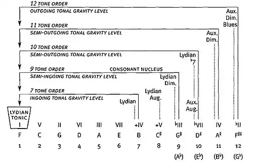 Este diagrama establece los niveles de cercanía que cada sonido posee con la tónica lidia y el tipo de sonido o “color” que existe en cada nivel.