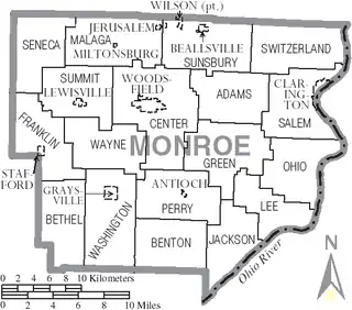 - Esta obra contiene una traducción derivada de «Monroe County, Ohio» de Wikipedia en inglés, publicada por sus editores bajo la Licencia de documentación libre de GNU y la Licencia Creative Commons Atribución-CompartirIgual 4.0 Internacional.
