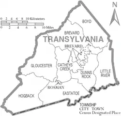 Mapa del Condado de Transylvania en Carolina del Norte con sus municipios