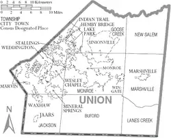 El condado se divide en nueve municipios: Municipio de Buford, Municipio de Goose Creek, Municipio de Jackson, Municipio de Lanes Creek, Municipio de Marshville, Municipio de Monroe, Municipio de New Salem, Municipio de Sandy Ridge y Municipio de Vance.