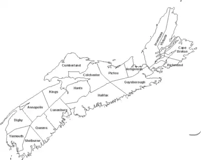 La provincia canadiense de Nueva Escocia está compuesta por 18 condados (en inglés: Counties). A continuación se da una lista de ellos ordenados alfabéticamente: