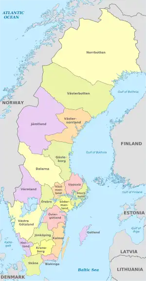 - Esta obra contiene una traducción derivada de «Counties of Sweden» de Wikipedia en inglés, publicada por sus editores bajo la Licencia de documentación libre de GNU y la Licencia Creative Commons Atribución-CompartirIgual 4.0 Internacional.
