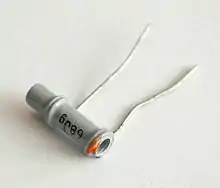- Condensador cerámico de paso, utilizado para derivación en circuitos de alta frecuencia. Forma de tubo, metalización interior en contacto con un conductor, metalización exterior para soldar