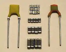Pero este dieléctrico paraeléctrico tenía una permitividad relativamente baja, por lo que sólo se podían realizar valores de capacitancia pequeños. La expansión del mercado de las radios en las décadas de 1930 y 1940 creó una demanda de valores de capacitancia más altos pero inferiores a los condensadores electrolíticos para aplicaciones de desacoplamiento de alta frecuencia. Descubierto en 1921, el material cerámico ferroeléctrico titanato de bario, con una permitividad del orden de 1.000, unas diez veces superior a la del dióxido de titanio o la mica, empezó a desempeñar un papel mucho más importante en las aplicaciones electrónicas.[1][2]