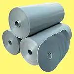 Las láminas de ánodo de aluminio se fabrican como los llamados "rollos madre" de unos 500 mm de ancho. Están preformados para la tensión nominal deseada y con la estructura de capa de óxido deseada. Para la producción de los condensadores, las anchuras y longitudes del ánodo, tal como se requiere para un condensador, se deben cortar del rollo madre.[10]