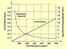El óxido amorfo tiene una proporción dieléctrica de ~ 1,4 nm / V. En comparación con el óxido de aluminio cristalino que tiene una relación dieléctrica de ~ 1,0 nm / V, la variedad amorfa tiene una capacidad 40% inferior a la misma superficie de ánodo.[8] El inconveniente del óxido cristalino es la mayor sensibilidad al esfuerzo de tracción que puede provocar micro grietas cuando se somete a estresores mecánicos (de bobinado) o térmicos (de soldadura) que dan lugar a procesos de post-formación más altos.