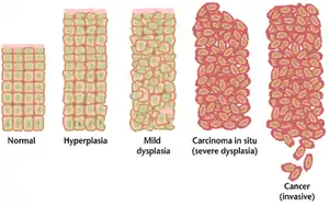 Patológicamente, las lesiones precancerosas pueden variar desde neoplasias benignas, que son tumores que no invaden los tejidos normales adyacentes y no se diseminan a órganos distantes, hasta la displasia,[1] que involucra un agrupamiento de células anormales, que en algunos casos tienen un mayor riesgo de progresar a anaplasia y cáncer invasivo. A veces se usa el término "precáncer" para el carcinoma in situ, que es un cáncer no invasivo que no ha progresado a una etapa agresiva e invasiva. Al igual que con otras afecciones precancerosas, no todos los carcinomas in situ progresarán a una enfermedad invasiva.[6]