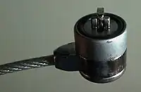 Las cerraduras se aseguran en el equipo con una llave o un dispositivo PIN mecánico, y llevan anclado un cable de acero recubierto de goma o plástico, con un pequeño lazo al otro extremo que permite engancharlo a un objeto permanente como la pata de la mesa, para asegurarlo en su sitio.