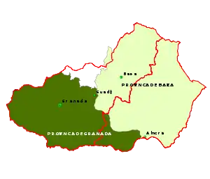 - El límite con la provincia de Almería estaría fijado en el río Adra, por lo que la localidad homónima estaría incorporada a la provincia granadina. En la Alpujarra, Válor queda para Granada y Ohanes para Almería. Más hacia el norte se toman como límites las sierras de Baza, Oria, María y Periate hasta llegar a la provincia de Murcia.[47]