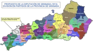La propuesta para llevar a efecto la nueva reorganización territorial granadina fue formulada por la Diputación de Granada de acuerdo con la Audiencia Territorial y fue remitida al Rey el 7 de julio de 1813. Aunque los límites provinciales eran de nuevo muy similares a los que existían a finales del siglo XVIII, el cambio más significativo se concretó en la incorporación de los partidos de Antequera y Archidona, cuyos bordes seguían el actual límite de las provincias de Málaga y Córdoba hasta Fuente de Piedra, excluidas las poblaciones de Teba y Campillos, Alameda, Peñarrubia, Sierra de Yeguas, Ardales, Almargen y Cañete la Real. La división interna en partidos sí varió de manera muy significativa respecto de la que estaba vigente a mediados del siglo XVIII, pues pasaron de ser 20 a 35.[41]