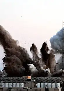 El mismo día, otro bombardeo israelí derrumbó la torre al-Jalaa de 12 plantas en la ciudad de Gaza, sede de las oficinas locales de Associated Press, Al Jazeera y otros medios internacionales.[87] Las Fuerzas Armadas de Israel emitieron un comunicado oficial alegando que "El sitio fue utilizado por la organización terrorista Hamás para la investigación y el desarrollo de inteligencia y para llevar a cabo operaciones SIGINT (inteligencia de señales), ELINT (inteligencia de señales electrónicas) y EW (guerra electrónica), dirigidas tanto a la actividad operativa de las FDI como a los sistemas civiles en Israel. Uno de los principales objetivos de estos esfuerzos era desarrollar un sistema que interrumpiera el sistema de defensa aérea Cúpula de Hierro"; tras lo que agregó que "El objetivo era de alto valor militar para Hamás y fue investigado de acuerdo con procedimientos rigurosos dentro de las FDI y de conformidad con el derecho internacional....Se hicieron esfuerzos considerables para que los civiles pudieran evacuar el edificio. El proceso de evacuación fue meticuloso y, como resultado, ningún civil resultó herido". Así mismo declara que "Este evento debe ser puesto en un contexto en el que Hamás opera intencionadamente entre la población civil de Gaza y lo hace con el fin de obstaculizar la actividad operativa de las FDI".[100] Por su parte, Hamás negó haber usado la Torre al-Jalaa y calificó el ataque como un "crimen de guerra".[101] Un portavoz de Hamás, Hazem Qassem, declaró ante un reportero de la BBC que "las constantes mentiras de [las autoridades de] la ocupación israelí sobre la presencia de oficinas de Hamás en la Torre al-Jalaa son un intento fallido de justificar su crimen, que tenía como objetivo un edificio civil que alberga las oficinas de los medios de comunicación y los canales de televisión internacionales".[101]