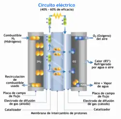 La PEM está intercalada entre dos electrodos que tienen el catalizador incrustado en ellas. Los electrodos están eléctricamente aislados entre sí por la PEM. Estos dos electrodos forman el ánodo y el cátodo respectivamente.