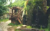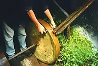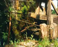 - Sistema hidráulico, formado por un canal de madera por donde discurre el agua y una rueda que mide 2 m de diámetro y que lleva unas 16 palas que las mueve el impulso del agua. Con su movimiento arrastran el árbol o eje donde van intercaladas