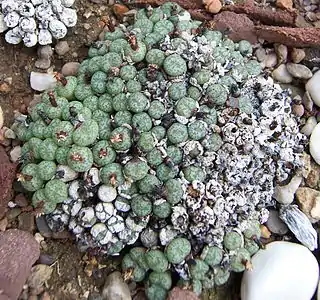 Está formada por pequeños cuerpos carnosos que forman grupos compactos de hojas casi esféricas, soldadas hasta el punto de que sólo una muy pequeña diferencia separan a las dos hojas. En la naturaleza, los grupos de hojas se esconden entre las rocas y en las grietas, que retienen depósitos apreciable de arcilla y arena.