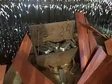 Mural que representa amarres de un barco, un mosquete de mecha (evolución del arcabuz), un capitán español y filones de oro puro. Pabellón de la Navegación, Sevilla, España.