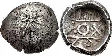 - las monedas locales de la época aqueménida (...) fueron los precursores de las barras dobladas y marcadas por el golpe" en Bopearachchi, Osmund Bopearachchi, Osmund. Coin Production and Circulation in Central Asia and North-West India (Before and after Alexander's Conquest) (en inglés). p. 311.