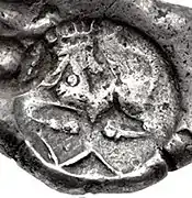 - "Coins of this type found in Chaman Hazouri (deposited c.350 BC) and Bhir Mound hoards (deposited c.300 BC)." Article by Joe Cribb and Osmund Bopearachchi in Errington, Elizabeth; Trust, Ancient India and Iran; Museum, Fitzwilliam (1992). The Crossroads of Asia: transformation in image and symbol in the art of ancient Afghanistan and Pakistan (en inglés). Ancient India and Iran Trust. pp. 57-59. ISBN 9780951839911.