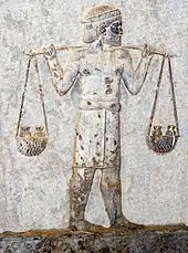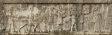 Los relieves del Palacio Apadana en Persépolis describen a los portadores de tributos de 23 satrapías que visitaron la corte aqueménida. Estos se encuentran en el extremo sur de la Escalera Apadana. Entre los extranjeros los árabes, los tracios, los bactrianos, los indios (de la zona del valle del Indo), los partos, los capadocios, los elamitas o los medios. Los indios del valle del Indo son de pecho desnudo, excepto su líder, y descalzos y llevan el dhoti.Traen canastas con jarrones dentro, llevan hachas y llevan un burro.[59] Un hombre en la procesión india lleva una carga pequeña pero visiblemente pesada de cuatro frascos sobre un yugo, sugiriendo que llevaba algo del polvo de oro pagado por los indios como tributo a la corte aqueménida.[58]