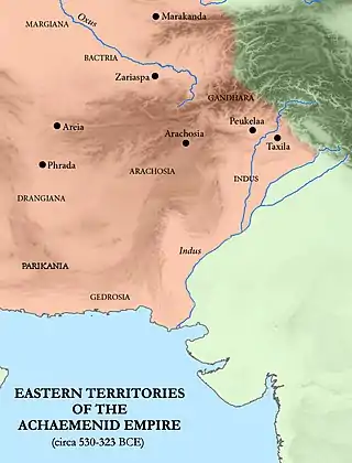 ![]() Frontera oriental del Imperio aqueménida y los reinos y ciudades de la antigua India (alrededor del año 500 a. C.).[1][2][3][4] | ||||