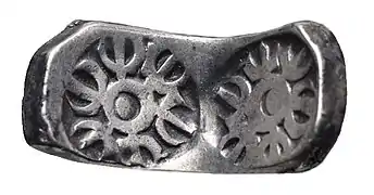 - "Silver bent-bar punch-marked coin of Kabul region under the Achaemenid Empire, c.350 BC: Coins of this type found in quantity in Chaman Hazouri and Bhir Mound hoards" Article by Joe Cribb and Osmund Bopearachchi in Errington, Elizabeth; Trust, Ancient India and Iran; Museum, Fitzwilliam (1992). The Crossroads of Asia: transformation in image and symbol in the art of ancient Afghanistan and Pakistan (en inglés). Ancient India and Iran Trust. pp. 57-59. ISBN 9780951839911.