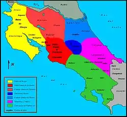 Los siguas (de etnia mesoamericana) ocupaban un sitio de la costa llamado el Valle del Duy o Coaza, entre los ríos Sixaola y Changuinola, en el litoral atlántico, y eran una colonia que comerciaba por mar con las poblaciones costeras desde Yucatán a Panamá. Los changuinola ocupaban los ríos Puan y Changuinola, y los doraces vivían en la Bahía del Almirante (actual Panamá). Los guaimíes se asentaban en la Cordillera de Talamanca y la región de Chiriquí, hasta el Pacífico. De todos estos grupos provienen las tradiciones de los cabécares, térrabas y bribris.[16] En la región del Pacífico Sur, se encontraban los quepoa, los turucaca, los cotos y los brunca (o boruca).[17]