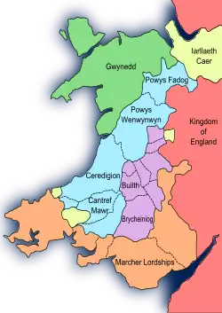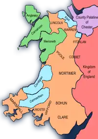 El principado de Gwynedd era el poder dominante en Gales en la primera mitad del siglo XIII, con Powys y Deheubarth convertidos en estados tributarios.[3] Los príncipes de Gwynedd asumieron el título de "Príncipe de Gales".[4] Pero la guerra con Inglaterra en 1241 y 1245, seguida de una disputa dinástica en la sucesión al trono debilitó a Gwynedd y permitió a Enrique III apoderarse de Perfeddwlad (también conocido como los "Cuatro Cantrefs",[5] la parte oriental del principado).[6][7] Sin embargo, a partir de 1256 el resurgimiento de Gwynedd bajo Llywelyn ap Gruffydd (que sería conocido como Llywelyn el Último Rey) reanudó la guerra con Enrique y recuperó Perfeddwlad.[7] Por el Tratado de Montgomery de 1267, se restableció la paz y, a cambio de hacer homenaje al rey inglés, Llywelyn fue reconocido como Príncipe de Gales y su reconquista de Perfeddwlad fue aceptada por Enrique.[8][9] Sin embargo, las guerras esporádicas entre Llywelyn y algunos de los Señores de las Marcas, como Gilbert de Clare, Roger Mortimer y Humphrey de Bohun continuarían en los siguientes años.[10]