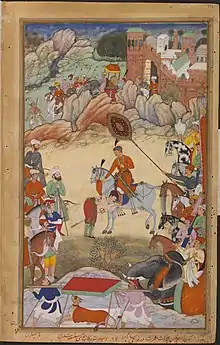 Jalaluddin Muhammad Akbar (1542-1605), hijo de Humayun, llegó al poder en 1556 a la edad de 14 años. Bajo la guía de su tutor y general del ejército, Bairam Khan, comenzó a eliminar a los pretendientes al trono del clan afgano: Hemu, un señor de la guerra hindú, en 1556 y Sikandar Shah Sur en 1557.[Frédéric 16]