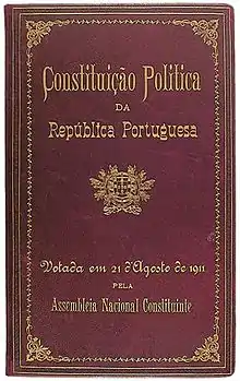 La constitución política de la República Portuguesa de 1911 se destaca por haber consagrado un nuevo régimen político (la República) siendo además el texto más corto de la historia constitucional portuguesa con apenas 87 artículos, agrupados en siete títulos: