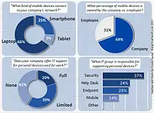 La Seguridad (64%) y la pérdida de datos (59%) siguen siendo las principales preocupaciones de la mayoría de las empresas que permiten a los empleados a llevar sus dispositivos personales al trabajo. Las implicaciones de cumplimiento y legales son la mayor preocupación en los EE. UU. y en Japón, que en Alemania. Para reducir los riesgos de seguridad y disminuir los costos de gestión, el 79% de los encuestados exigen a los empleados instalar soluciones de seguridad móvil en sus dispositivos móviles personales. El 69% de los encuestados coincidieron en que la seguridad del dispositivo móvil es un componente clave en la protección de sus entornos de IT de las amenazas de los dispositivos móviles de los consumidores, mientras que el 71% de los encuestados considera una combinación de seguridad móvil y gestión de dispositivos móviles como la más eficaz.