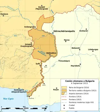 Los británicos emprendieron la ofensiva contra Galípoli el 6 de agosto de 1915, que evidenció la grave escasez de municiones del Imperio otomano. El 17 de agosto, el ministro de guerra turco, Enver Bajá, escribió al jefe del Estado Mayor alemán, Erich von Falkenhayn, para consultarle si se avecinaba una ofensiva austro-alemana contra Serbia. Cuando se le comunicó que esta dependía de la participación de Bulgaria, que a su vez estaba condicionada a la firma de un pacto otomano-búlgaro, los otomanos se apresuraron a pactar con Bulgaria el 22 de agosto.[2] Cedieron el río Maritsa y una franja de kilómetro y medio de anchura de la orilla izquierda del río.[3] Merced a ello, Bulgaria obtuvo el ferrocarril al puerto egeo de Dedeagach.[4] El cambio también hizo a Edirne (Adrianópolis) vulnerable a un eventual ataque búlgaro, pero la firma del acuerdo dependía de la firma de una convención militar entre Bulgaria, Austria-Hungría y Alemania.[2]