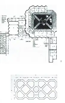 En el interior del claustro, las escaleras, baños y aseos, se ubicaron aprovechando las zonas trapezoidales que generaban cambios de dirección en la planta del propio conjunto. De esta forma, situando tales dependencias en dichos tramos, se lograba absorber estos espacios, que resultaban irregulares para poder emplearlos como por ejemplo habitaciones. Así, mediante esta configuración, se permitió que todas las otras salas, dependencias y dormitorios fuesen del mismo tamaño y forma.