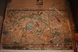 La pintura mural son objeto de innumerables estudios y opiniones, ya que tienen la particularidad de contener escenas de batallas con personajes indígenas. Lo inexplicable, es que no representan ninguna imagen cristiana o bíblica y que están dentro del templo, siendo completamente paganas.[13] Al interior del templo a en el lado norte se encuentra la primera del muro norte, destaca la figura de un guerrero ocelote en posición de ataque que parece salir de un florón.[14] En el extremo izquierdo, un guerrero cuyo traje no se alcanza a apreciar, somete a una mujer semidesnuda de vientre abultado.[14] También hay pinturas de guerreros, águilas y jaguares.[15] En el lado sur se encuentran escenas de distintas batallas, así como guerreros, águilas y jaguares.[16]