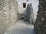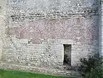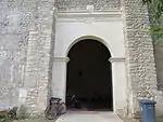 En la pared lateral izquierda de la nave principal, existe una gran puerta de acceso, en forma de arco de cantera andintelado flanqueado por dos columnas cuadradas, en la parte superior del arco tiene un relieve de la flor de liz y debajo del otro relieve de un rostro humano. En la columna de la derecha del arco tiene un relieve del sol y en la columna de la izquierda el relieve representa a la luna.
